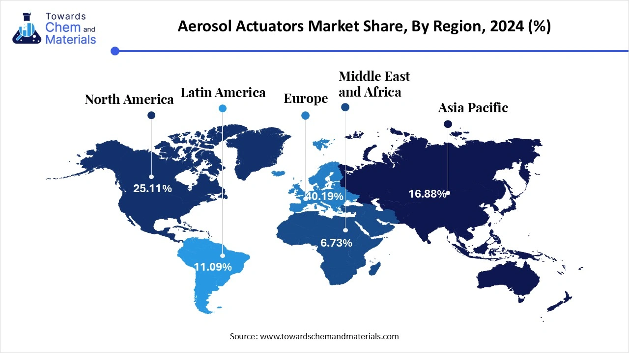 Europe dominated the aerosol actuators market in 2024. The strong presence of renowned cosmetic brands, the manufacturing industry, and the high-spending ability of consumers drive market growth. The presence of companies like Lindal, Coster, and Aptar fuels the market growth.