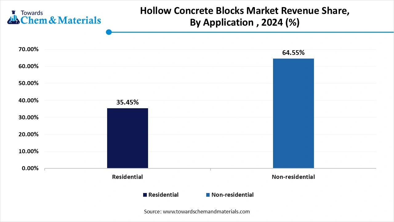 The non-residential segment held the dominating share of the hollow concrete blocks market in 2024. The rising demand from commercial buildings like malls, offices, hotels, and retail spaces drives the market growth. In the non-residential sector, split-faced hollow concrete blocks are widely used due to their sound absorption, thermal efficiency, and fire resistance.