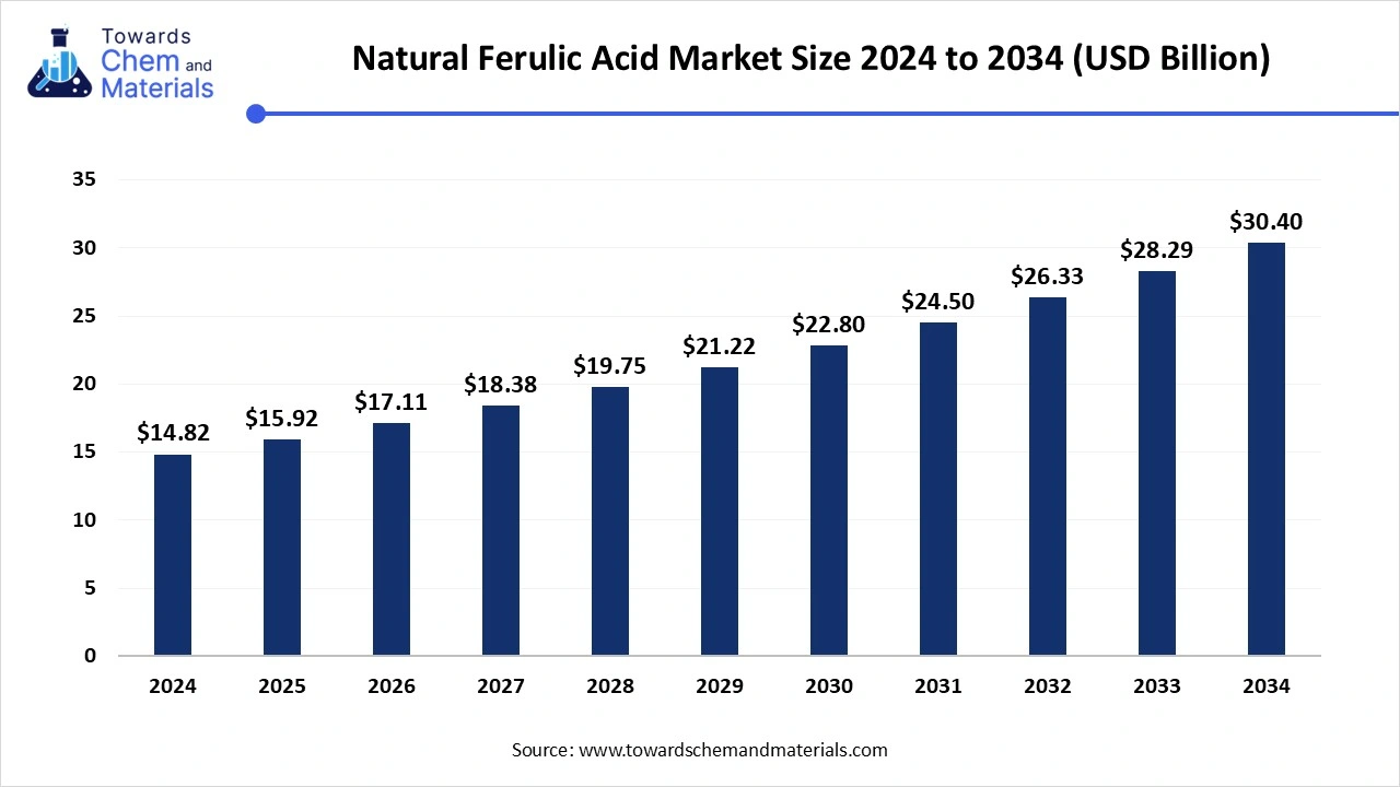 The global natural ferulic acid market size was reached at USD 14.82 billion in 2024 and is expected to hit around USD 30.40 billion by 2034, exhibiting a compound annual growth rate (CAGR) of 7.45% during the forecast period 2025 to 2034.The rising consumer demand for natural and organic products drives the market to grow significantly in the forecasted period.