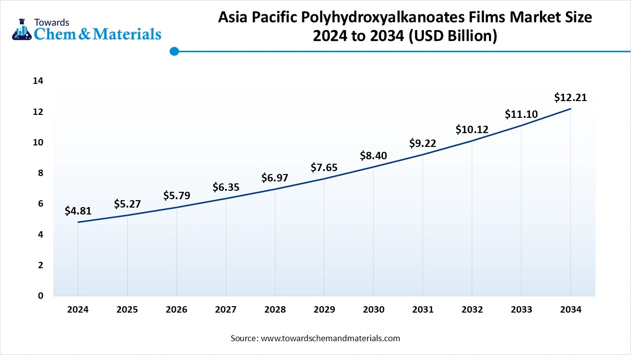 The Asia Pacific polyhydroxyalkanoates films market is expected to increase from USD 5.27 billion in 2025 to USD 12.21 billion by 2034, growing at a CAGR of 9.76% throughout the forecast period from 2025 to 2034.